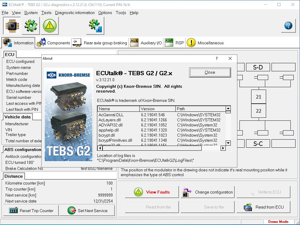 ECUtalk is a computer-based diagnostic application designed for Knorr-Bremse electronic braking systems installed in trailers. In addition to diagnosing the braking system, the application facilitates the configuration of numerous extra features of the trailer control system, enhancing the capabilities of these systems. Using this diagnostic tool, users can view and erase the fault memory, as well as perform an extensive system test. An automated End-of-Line Test that produces a final report verifies the proper installation and connectivity of the braking module.
